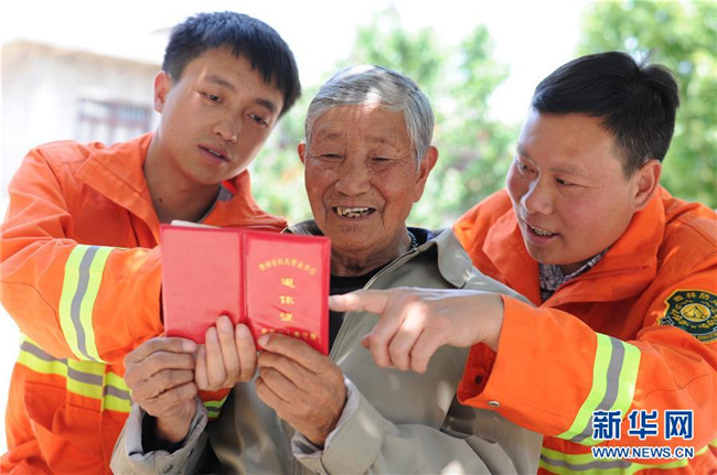 4月27日,在貴州省畢節(jié)市赫章縣平山國(guó)有林場(chǎng),李代關(guān)老人(中)向兒子李瓊江(右)、孫子李健展示他的退休證。 新華社記者 楊楹 攝