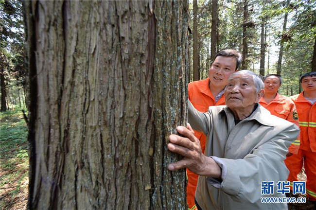 4月27日,在貴州省畢節(jié)市赫章縣平山國(guó)有林場(chǎng),李代關(guān)老人(前)在查看當(dāng)年和同事種的杉樹。 新華社記者 楊楹 攝