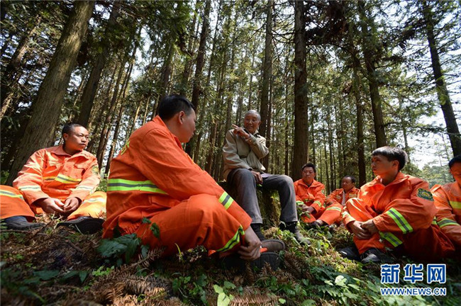 4月27日,在貴州省畢節(jié)市赫章縣平山國(guó)有林場(chǎng),李代關(guān)老人(左三)與林場(chǎng)職工交流。  新華社記者 楊楹 攝