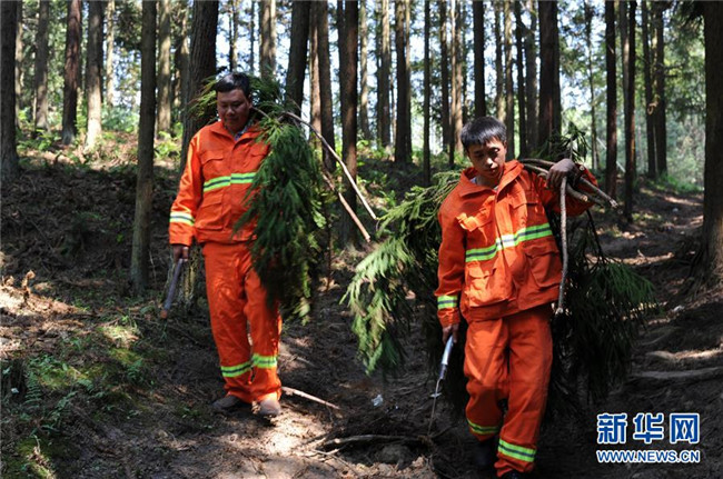 4月27日,在貴州省畢節(jié)市赫章縣平山國(guó)有林場(chǎng),李瓊江(左)和李健搬運(yùn)清除的雜灌木。 新華社記者 楊楹 攝