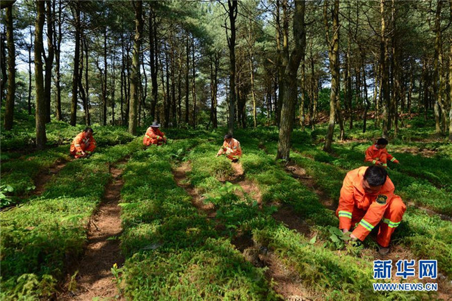 4月27日,平山國(guó)有林場(chǎng)職工在查看林下營(yíng)養(yǎng)袋育苗長(zhǎng)勢(shì)情況。 新華社發(fā)(尚宇杰 攝)