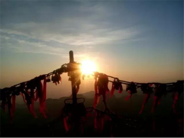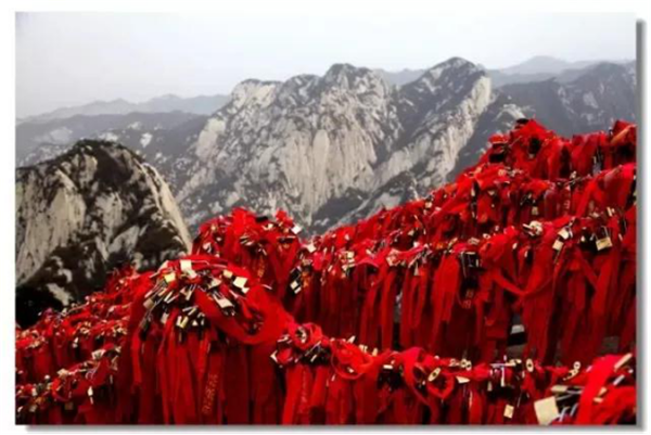 華山是一座愛(ài)情的殿堂,華山上的愛(ài)情故事悲烈、凄美而感人。我們?cè)?jīng)為世界上許許多多的愛(ài)情故事所感動(dòng)。其實(shí),發(fā)生在華山上的愛(ài)情故事一樣讓人的心情無(wú)法平靜。眾所周知的神話傳說(shuō)《寶蓮燈》中,三圣母為了愛(ài)情,被二郎神巨石壓在華山頂上;弄玉為了愛(ài)情,逃離安逸的生活,與蕭史雙雙來(lái)到華山,琴瑟合鳴;漢臣王咸不畏艱險(xiǎn),到華山尋找賢妻南陽(yáng)公主等等這些愛(ài)情故事,感天動(dòng)地,流傳不衰,不知讓多少人為之贊嘆。也許是讓華山上這些動(dòng)人的愛(ài)情故事所感染,不知從什么時(shí)候開始,在代表著堅(jiān)實(shí)連接的一串串鐵鏈上,游人掛上了閃閃的金鎖,把矢志不渝的愛(ài)情鎖在華山上,在華山的見(jiàn)證下,祝愿自己的愛(ài)情如同華山一樣永遠(yuǎn)不會(huì)改變。