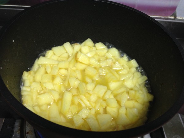 6.倒入少許水淀粉收汁冷卻備用,加入水淀粉可以讓蘋果丁口感會(huì)更綿滑