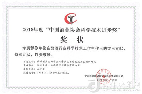 近日,中國酒業(yè)協(xié)會第五屆理事會擴大會議在北京隆重舉行,大會突出表彰了在釀酒產(chǎn)業(yè)科技發(fā)明、技術(shù)推廣、科技成果轉(zhuǎn)化等方面取得了杰出業(yè)績和重要貢獻的領(lǐng)軍人才和優(yōu)秀專家,表彰了2018年度“中國酒業(yè)協(xié)會科學技術(shù)獎”獲獎項目和論文的完成單位及個人,并頒發(fā)證書及獎金。西鳳集團公司《西鳳酒用大曲中土味素產(chǎn)生菌的發(fā)現(xiàn)及其控制研究》項目榮獲中國酒業(yè)協(xié)會科學技術(shù)進步獎三等獎。受到了大會表彰。