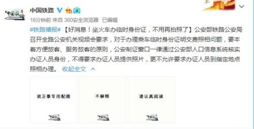 原標題:鐵總:坐火車辦臨時身份證不得要求辦證人員提供照片