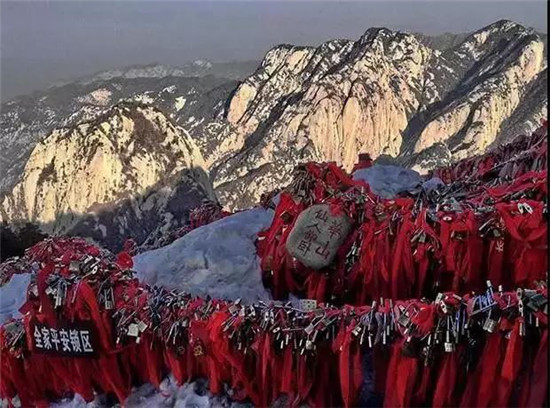華山的金鎖關(guān)建在三峰口的一座石拱門處,關(guān)北接五云峰,南控華山主峰,東西兩側(cè)壑深千丈,是名副其實的咽喉要道。杜甫《望岳》詩中“箭栝通天有一門”指的就是這里。道家認(rèn)為,華岳為仙鄉(xiāng)神府,只有過了通天門,才算進(jìn)入仙境,所以便有“過了金鎖關(guān),另是一重天”的民謠。