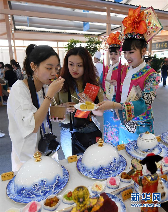 5月16日,在北京奧林匹克公園,參觀(guān)者品嘗北京風(fēng)味小吃。新華社記者 王毓國(guó) 攝