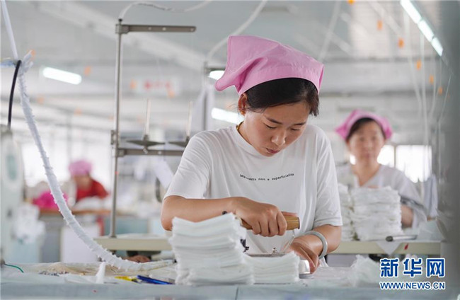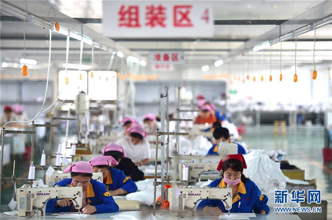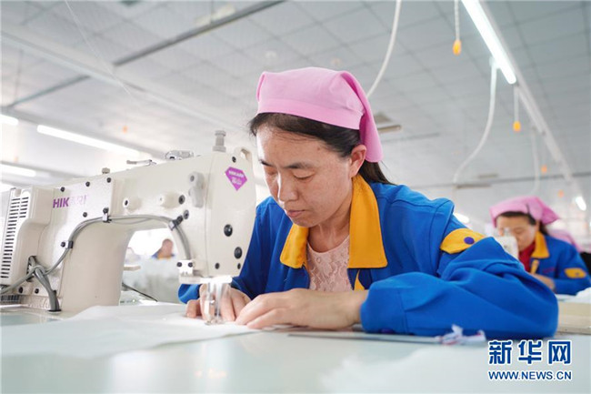 5月16日,鹽山縣慶云鎮(zhèn)村民在凱瑞斯服裝廠工作。該服裝廠總部位于雄安新區(qū)容城縣,為配合雄安新區(qū)產業(yè)轉型升級,于2018年初來到河北省鹽山縣開設工廠。 新華社記者 邢廣利 攝