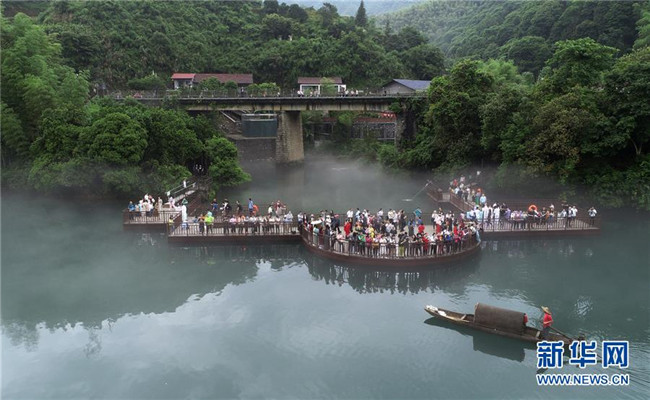 5月25日清晨,一艘小船劃過(guò)小東江江面,吸引游人駐足(無(wú)人機(jī)拍攝)。新華社發(fā)(朱孝榮 攝)