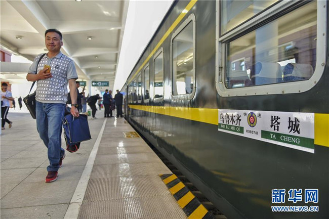 5月30日,在新疆塔城火車(chē)站,旅客準(zhǔn)備登上塔城—烏魯木齊K9858次列車(chē)。新華社發(fā)(擺風(fēng)亮 攝)