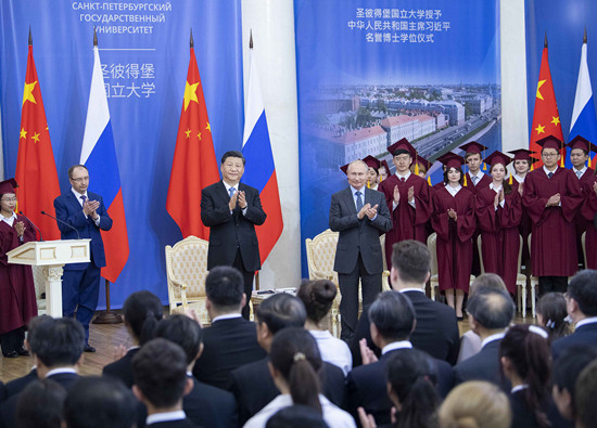 當(dāng)?shù)貢r(shí)間6月6日,又一場(chǎng)特殊儀式在圣彼得堡國(guó)立大學(xué)舉行。習(xí)近平被授予圣彼得堡國(guó)立大學(xué)名譽(yù)博士學(xué)位。他在答辭中說(shuō)道,這既是雙方教育和人文領(lǐng)域密切交流的例證,更是中俄關(guān)系高水平的重要體現(xiàn)。他同時(shí)希望雙方不斷擴(kuò)大教育領(lǐng)域交流合作。