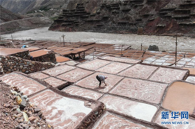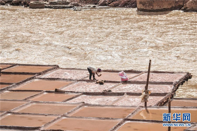 西藏芒康縣納西民族鄉(xiāng)加達村一名村民在收集鹽田曬的鹽(6月4日攝)。新華社記者晉美多吉攝