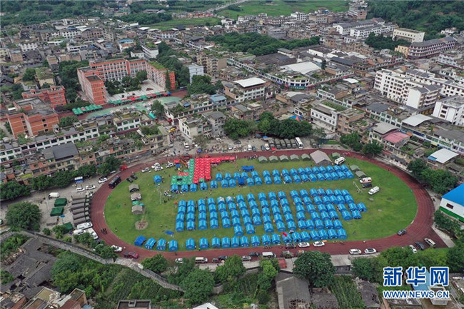 6月18日無人機(jī)拍攝的長寧縣雙河中學(xué)安置點。 新華社發(fā)(曾朗 攝)