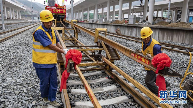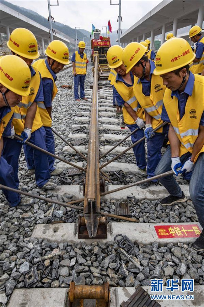 6月22日,中鐵十一局三公司職工在湖北省十堰市十堰北站鋪設(shè)漢十高鐵最后一組500米長軌。新華社記者 杜華舉 攝