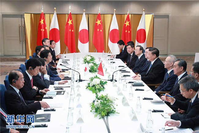 習(xí)近平強(qiáng)調(diào),雙方要始終恪守中日四個(gè)政治文件確立的各項(xiàng)原則,踐行中日“互為合作伙伴、互不構(gòu)成威脅”的政治共識(shí),增進(jìn)互信,推動(dòng)中日關(guān)系始終沿著和平、友好、合作的正確軌道持續(xù)向前發(fā)展。要深化經(jīng)貿(mào)、投資、第三方市場(chǎng)、科技創(chuàng)新等廣泛領(lǐng)域合作,打造新的合作增長(zhǎng)點(diǎn),積極引領(lǐng)區(qū)域經(jīng)濟(jì)一體化。我們歡迎日本企業(yè)積極擴(kuò)大對(duì)華合作,分享中國(guó)發(fā)展新機(jī)遇。共建“一帶一路”倡議為中日互利合作開辟了廣闊天地,歡迎日方積極參與。雙方要拉緊人文紐帶,加強(qiáng)兩國(guó)青少年交流,促進(jìn)兩國(guó)民眾相知相親。我贊同年內(nèi)啟動(dòng)中日高級(jí)別人文交流磋商機(jī)制。要通過(guò)對(duì)話協(xié)商建設(shè)性管控矛盾分歧,加強(qiáng)外交和安全領(lǐng)域?qū)υ?,?gòu)建建設(shè)性雙邊安全關(guān)系。希望日方恪守迄今共識(shí)和承諾,妥善處理好歷史等敏感問(wèn)題,共同維護(hù)東海和平穩(wěn)定。中日應(yīng)該加強(qiáng)在國(guó)際和地區(qū)事務(wù)中的溝通、協(xié)調(diào)、合作,共同應(yīng)對(duì)全球性挑戰(zhàn),推動(dòng)全球治理更加公正合理。中方支持日方辦好二十國(guó)集團(tuán)領(lǐng)導(dǎo)人大阪峰會(huì),期待峰會(huì)發(fā)出維護(hù)多邊主義和自由貿(mào)易的明確聲音,為世界經(jīng)濟(jì)發(fā)展注入穩(wěn)定預(yù)期和動(dòng)力。