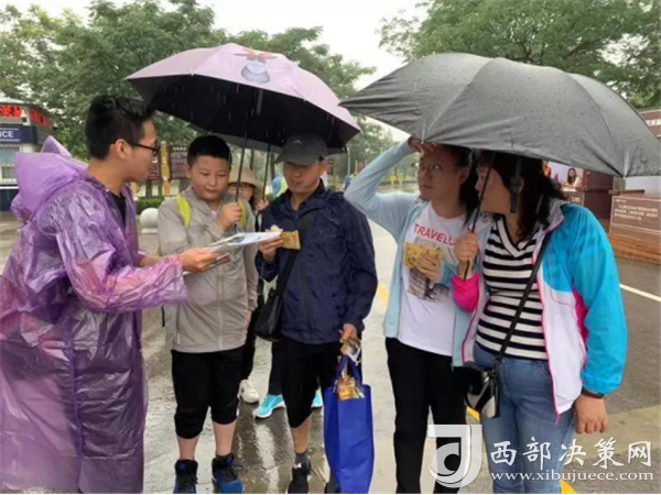 志愿者向游客宣傳環(huán)保小知識(shí)并送上景區(qū)宣傳彩頁(yè)