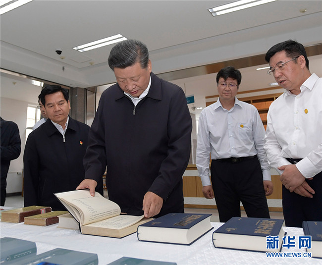 7月15日至16日,中共中央總書記、國家主席、中央軍委主席習(xí)近平在內(nèi)蒙古考察并指導(dǎo)開展“不忘初心、牢記使命”主題教育。這是16日,習(xí)近平在位于呼和浩特市的內(nèi)蒙古大學(xué)了解學(xué)校建設(shè)發(fā)展歷史、教學(xué)科研工作情況。 新華社記者 李學(xué)仁 攝