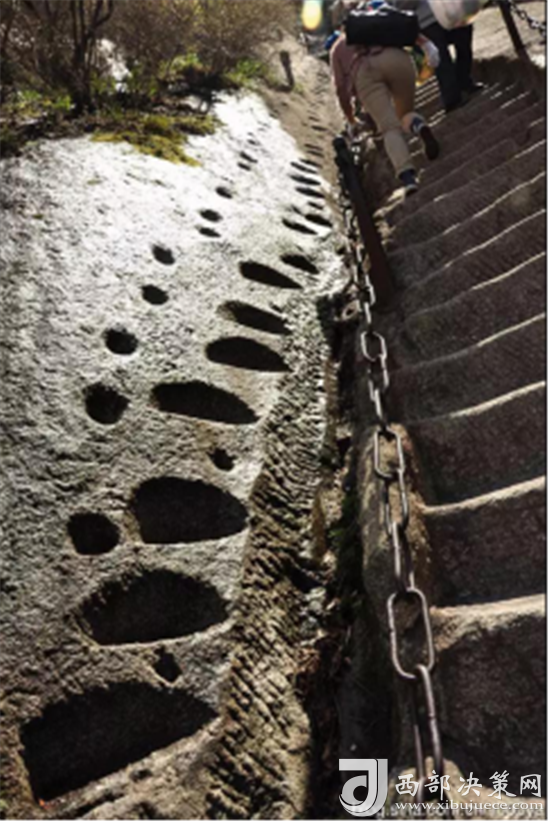第二道險(xiǎn)關(guān)是百尺峽。這里兩壁高聳,中間夾著一塊從天而降的巨石,上刻“驚心石”三個(gè)大字,游人從石下小路穿過(guò),確實(shí)驚心動(dòng)魄。第三道險(xiǎn)關(guān)是老君犁溝,這是夾在陡峭石壁之間的一條溝狀險(xiǎn)道,有570多個(gè)石階。相傳這里原先根本沒有路,太上老君見了,就將手中的如意柄變成一張鐵犁, 又牽來(lái)青牛,一夜間犁成了這條山溝。傳說(shuō)青牛犁完溝后,見華山景色壯美,便化為石牛,永遠(yuǎn)地留在了華山之上。溝的盡頭是一道陡壁, 名為“猢猻愁”。顧名思義,連猴子都發(fā)愁,可見這里的山勢(shì)多么陡峭。