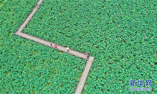 在江西省南昌市新建區(qū)聯(lián)圩鎮(zhèn),游客在當(dāng)?shù)氐那М€荷花園觀賞游玩(7月20日無人機拍攝)。