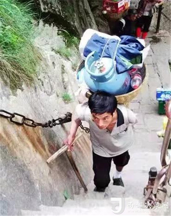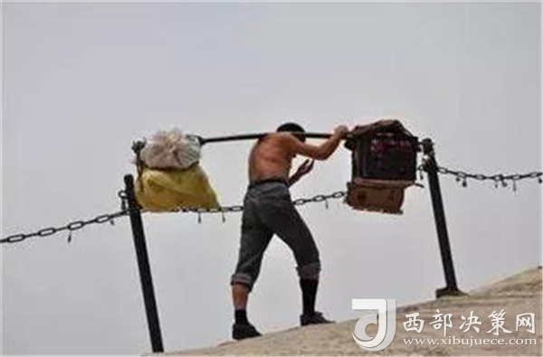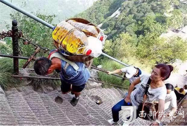 一位挑山工說:挑夫這個(gè)苦力活,已經(jīng)沒有年輕人來做。如今35歲以下的年輕人,對這個(gè)活瞧不上眼,寧可閑著,也不做挑夫。但是,華山景區(qū)的正常運(yùn)營及后期建設(shè),必須依賴于挑夫。這活兒,總得有人做。