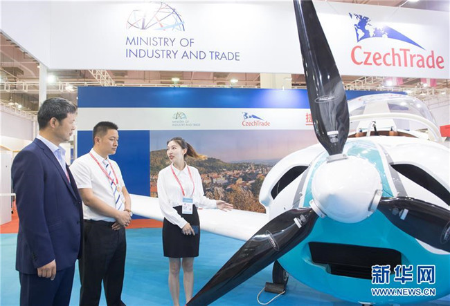 6月8日,在浙江寧波舉行的首屆中國-中東歐國家博覽會上,一名展商(右)在介紹捷克生產(chǎn)的一款輕型飛機。新華社記者 翁忻旸 攝
