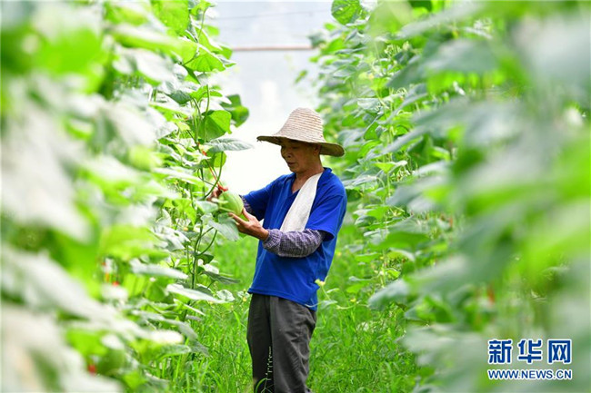 在廣西融安縣大良鎮(zhèn)古蘭村古蘭屯大棚基地,62歲的黃顯亮查看甜瓜生長情況(8月18日攝)。黃顯亮是大棚基地的技術(shù)員,每個(gè)月有3000多元的工資,已于2018年實(shí)現(xiàn)脫貧。 新華社記者 黃孝邦 攝