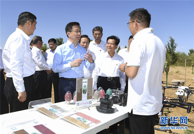 8月26日至27日,中共中央政治局常委、國(guó)務(wù)院副總理韓正到內(nèi)蒙古自治區(qū)鄂爾多斯市,就庫(kù)布其沙漠防沙治沙和生態(tài)建設(shè)情況進(jìn)行調(diào)研。這是8月27日,韓正來(lái)到位于庫(kù)布其沙漠腹地的沙峰綠谷,實(shí)地查看科技手段治沙成果。新華社記者 張領(lǐng) 攝