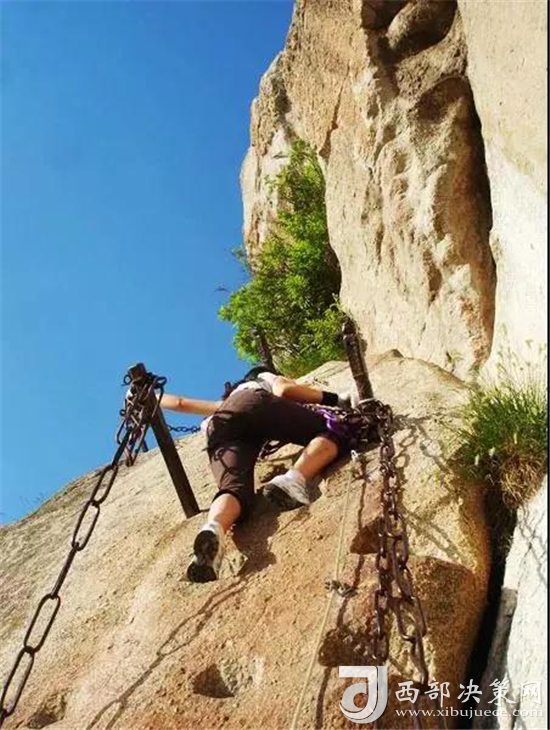 這是一條峭壁上的大裂縫,陷在兩旁的巨石之間,共370余級(jí)臺(tái)階坡度極陡,每級(jí)臺(tái)階的寬度不過三分之一的腳掌,幸好兩旁都有可助攀爬的鐵鏈。仰望天際,一線天開。俯視腳下,如臨深淵。石級(jí)頂端有如井口,倘若把“井口”用鐵蓋蓋住,通往華山的道路便被堵塞,所以稱之為“太華咽喉”。