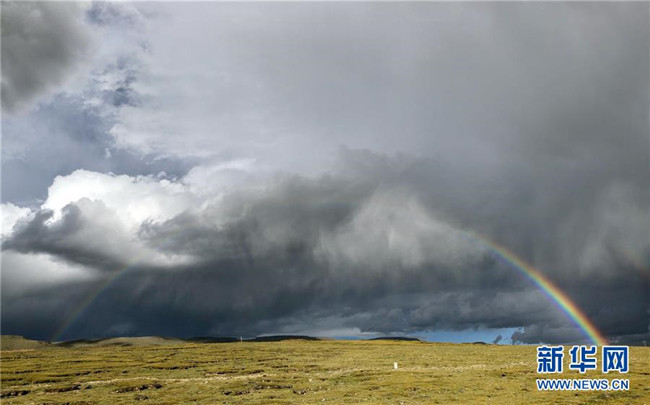 在青海省玉樹藏族自治州治多縣用手機(jī)拍攝的雨后彩虹(9月11日攝)。新華社記者鄒樂攝
