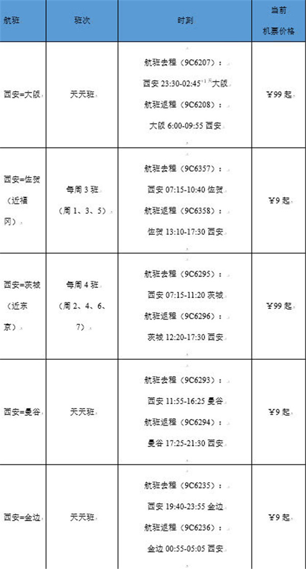 據(jù)了解,此次新開的航線及加密航線,將從2019年10月27日起陸續(xù)開始執(zhí)行,執(zhí)飛機型為空客A320。開航初期,機票價格相對優(yōu)惠,從春秋航空官網(wǎng)查詢到的價格來看,西安飛大阪、茨城(近東京)99元起(不含稅),西安飛佐賀(近福岡)、曼谷、金邊低至9元起(不含稅)。