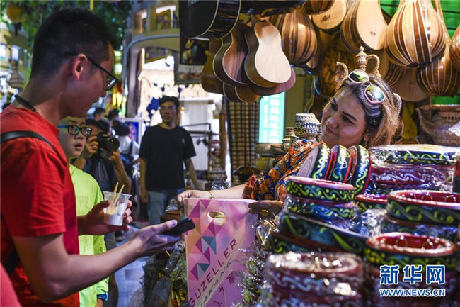 在位于烏魯木齊的大巴扎景區(qū),游客在觀光購物(8月8日攝)。  新華社記者 王菲 攝