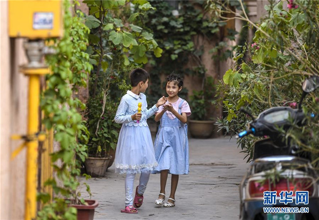 在新疆喀什古城景區(qū)內,當?shù)貎擅∨笥炎咴谙锏纼龋?月12日攝)。新華社記者 王菲 攝