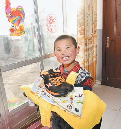互助縣班彥新村的兒童在剛遷入的新居內(nèi)展示新買的衣服。攝于2017年1月。新華社記者 吳 剛攝