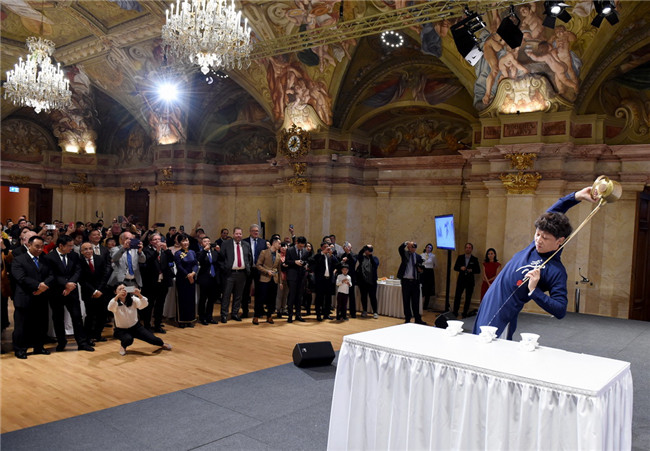 10月9日,在奧地利首都維也納“文化中國、錦繡四川”四川文化旅游展示會上,人們觀看茶藝表演。