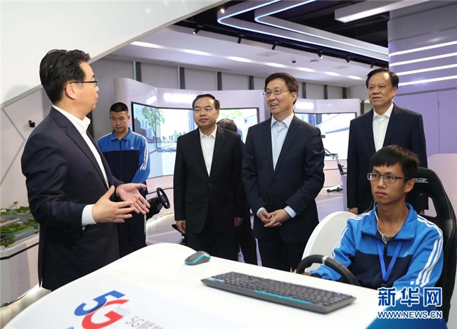 10月14日至15日,中共中央政治局常委、國務院副總理韓正在重慶市調研。這是10月15日,韓正來到禮嘉智慧公園,了解園區(qū)開發(fā)建設情況,體驗智能機器人和5G技術在遠程駕駛、教育、旅游等方面的應用。 新華社記者 劉衛(wèi)兵 攝