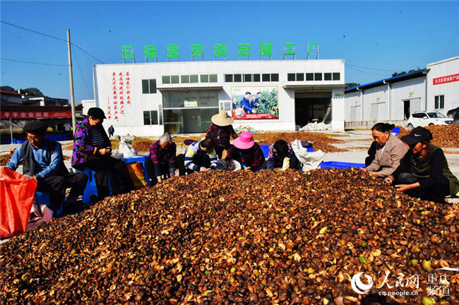 1月3日,在重慶市酉陽土家族苗族自治縣五福鎮(zhèn)的五福盈茶油定制工廠,工人們正忙著晾曬油茶籽,整個廠區(qū)一片繁忙景象。近年來,該縣采取“生態(tài)+產(chǎn)業(yè)”模式在荒山上開發(fā)的上萬畝油茶已陸續(xù)豐收,油茶產(chǎn)業(yè)成為當?shù)剞r(nóng)民脫貧致富產(chǎn)業(yè)之一。