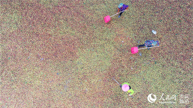 近日,重慶酉陽萬畝油茶喜獲豐收,工人們正忙著晾曬油茶籽。陳碧生攝近日,重慶酉陽萬畝油茶喜獲豐收,工人們正忙著晾曬油茶籽。陳碧生攝