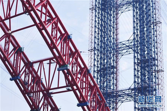 工人在進(jìn)行大橋主拱拱肋吊裝作業(yè)(12月8日攝)。
