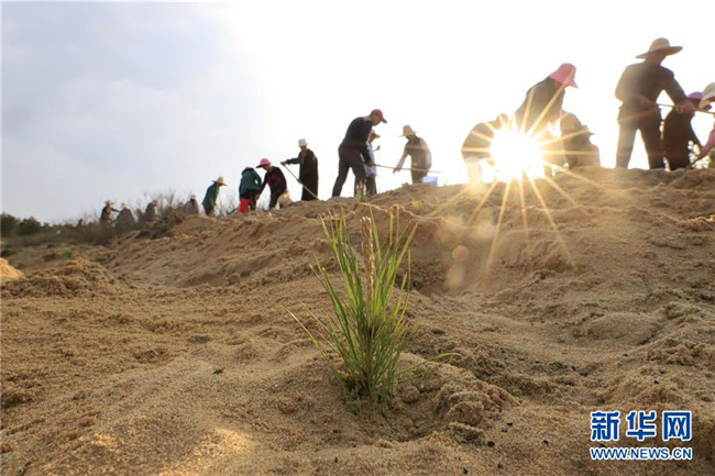 江西廬山市蓼南鄉(xiāng)組織村民在長江流域鄱陽湖畔的沙洲上種植瞿麥。瞿麥是一味中藥材,不僅有固沙綠化作用,還具有較高的經(jīng)濟價值(4月12日攝)。新華社發(fā)(韓俊烜 攝)