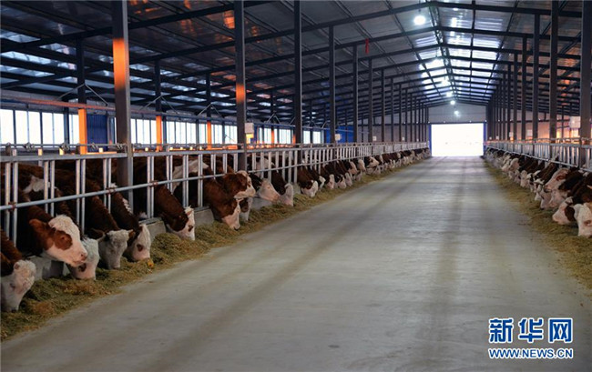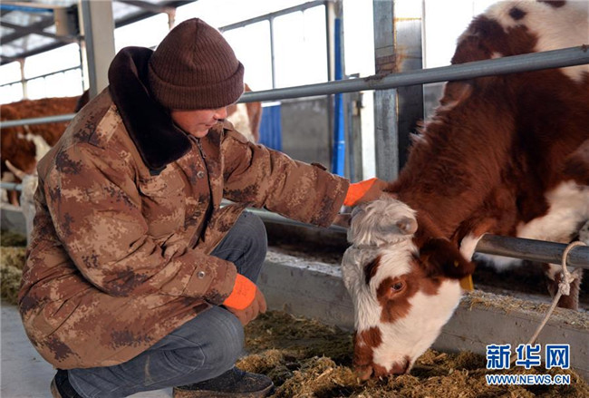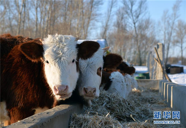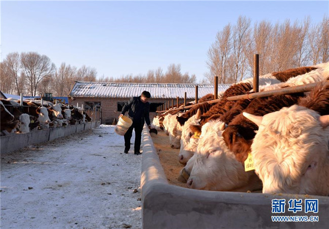 12月19日,科左后旗巴嘎塔拉蘇木劉金山養(yǎng)牛合作社的管理員劉德全在查看黃牛長(zhǎng)勢(shì)。新華社記者徐欽攝