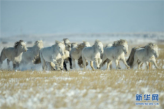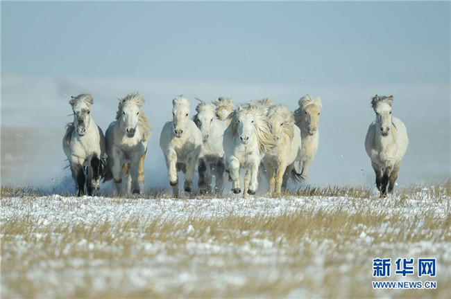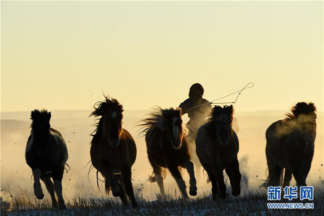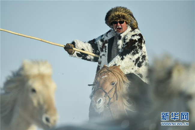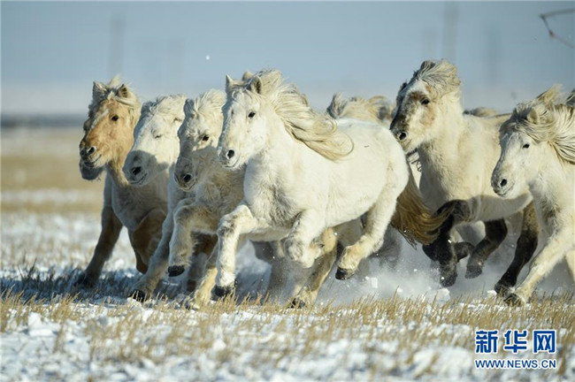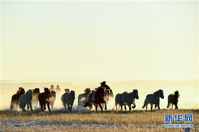 當日,內蒙古自治區(qū)錫林浩特市鳳凰馬場進行了一場馴馬活動。騎手們趕著馬群,在白茫茫的草原上奔跑,景象壯觀,吸引了不少游客和攝影愛好者前來觀賞。 新華社記者 劉磊 攝