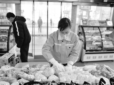 2月3日,中國石油天然氣股份有限公司青海西寧銷售分公司市區(qū)五四網(wǎng)點(diǎn)工作人員在貨架上整理蔬菜。