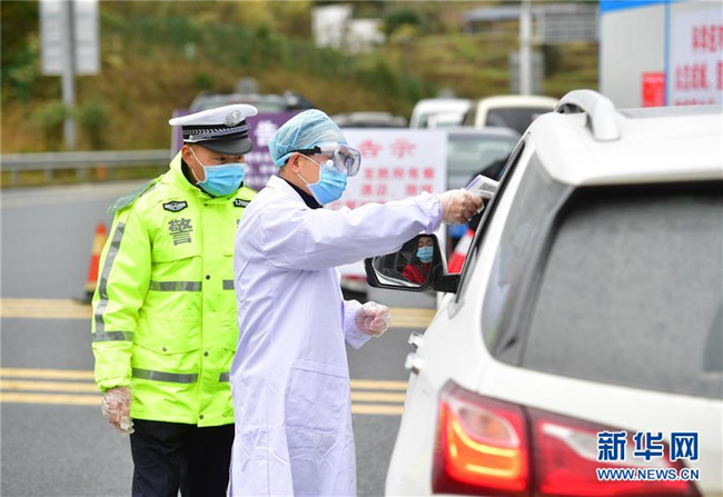 在廣西龍勝各族自治縣高速公路收費站出口,粟萬龍(右)對過往人員進行體溫檢測(2月8日攝)。