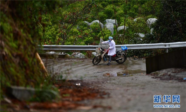 在廣西龍勝各族自治縣樂江鎮(zhèn)涼坪村,粟萬龍的哥哥粟從軍騎車上路,準備發(fā)放疫情防控宣傳材料(2月8日攝)。