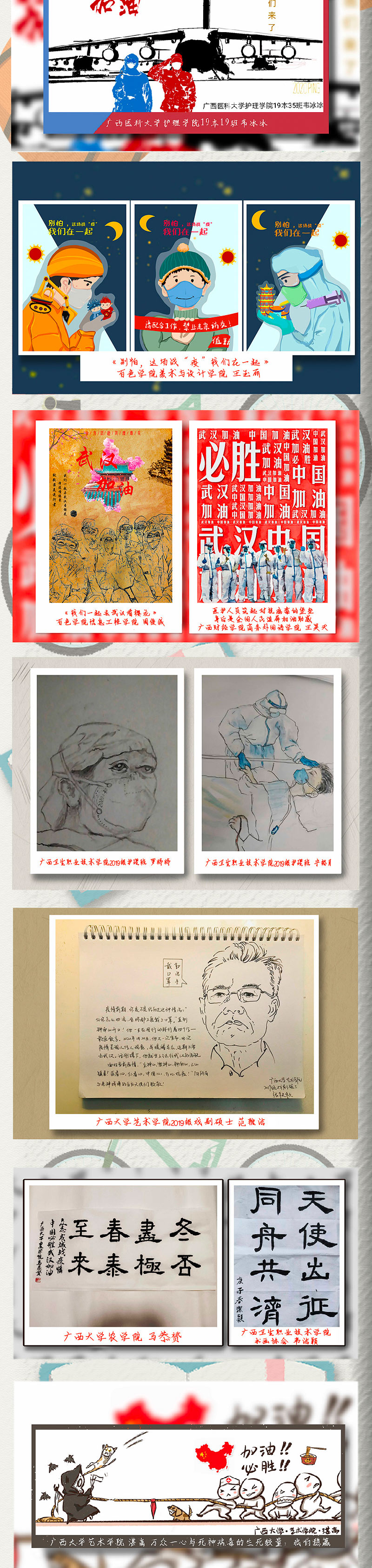 廣西各大高校的青年學(xué)子心系“疫”線,以抗擊疫情為主題創(chuàng)作了一批鼓舞人心的公益作品,向逆行英雄致敬,鼓勵人們積極樂觀面對疫情,以頑強(qiáng)意志、必勝信念打贏疫情阻擊戰(zhàn)。(彭遠(yuǎn)賀、實習(xí)生溫嘉康)