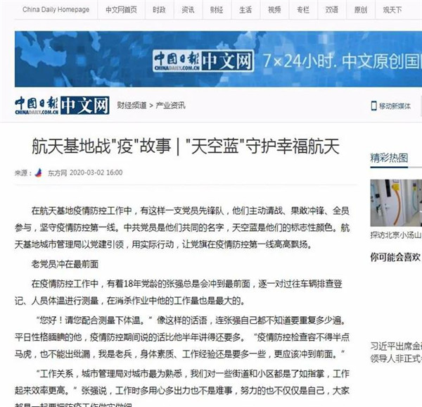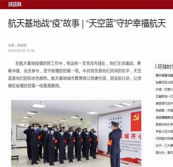 3月2日,航天基地《“天空藍(lán)”守護(hù)幸福航天》,講述了擁有18年黨齡的張強、退役士官魏斌、工作人緣好李鵬飛用行動展現(xiàn)共產(chǎn)黨人政治本色的積極實踐。國際在線、中國日報網(wǎng)、環(huán)球網(wǎng)、鳳凰網(wǎng)、西部網(wǎng)、三秦網(wǎng)、搜狐等近20家中央、省級、市級網(wǎng)絡(luò)媒體轉(zhuǎn)發(fā),網(wǎng)友產(chǎn)生強烈共鳴。
