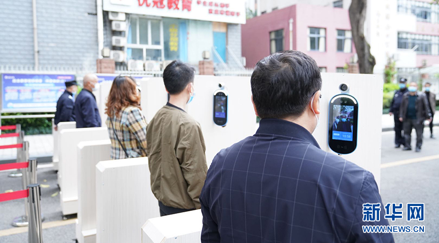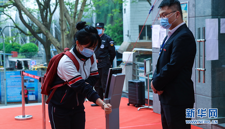 在重慶市第一中學(xué),大校門設(shè)置了多條紅外線成像體溫測(cè)控通道,能夠快速檢測(cè)到師生體溫并清楚顯示。學(xué)生從通道經(jīng)過時(shí),紅外線測(cè)溫儀會(huì)及時(shí)監(jiān)測(cè)通過者體溫,若有體溫異常者,設(shè)備會(huì)報(bào)警。圖為學(xué)校老師演習(xí)進(jìn)校場(chǎng)景。新華網(wǎng)發(fā)