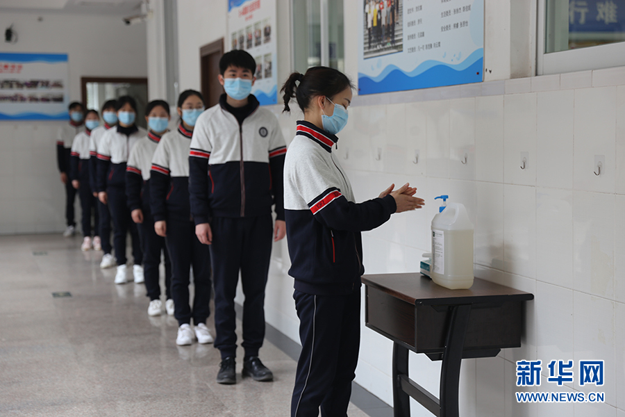 在西南大學(xué)附屬中學(xué),上課前學(xué)生需提前洗手,在教室外間隔1米左右排隊(duì)等待班主任檢查后進(jìn)入教室上課。班主任將戴好一次性醫(yī)用口罩和一次性手套逐一對(duì)學(xué)生進(jìn)行體溫檢查,并做好檢查登記。圖為學(xué)生演習(xí)進(jìn)教室環(huán)節(jié)。新華網(wǎng)發(fā)