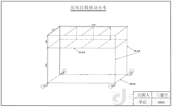 圖紙畫好后,王建業(yè)火速發(fā)給了材料員老王,老王憑借多年的人脈,在車間找來電焊師傅,又拾了廢棄的幾塊角鋼和幾個車輪,半晌就把王建業(yè)想要的東西給做了出來。其實(shí)很簡單,根據(jù)壓風(fēng)自救箱的尺寸,利用扁鐵構(gòu)建整體框架,下方安裝四個滑輪即可投入使用。
