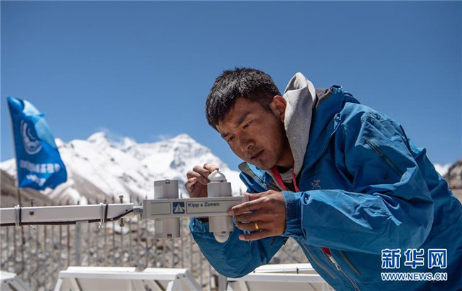 西藏自治區(qū)氣象局工作人員在珠峰大本營自動氣象站記錄氣象數(shù)據(jù)(5月10日攝)。新華社記者 普布扎西 攝